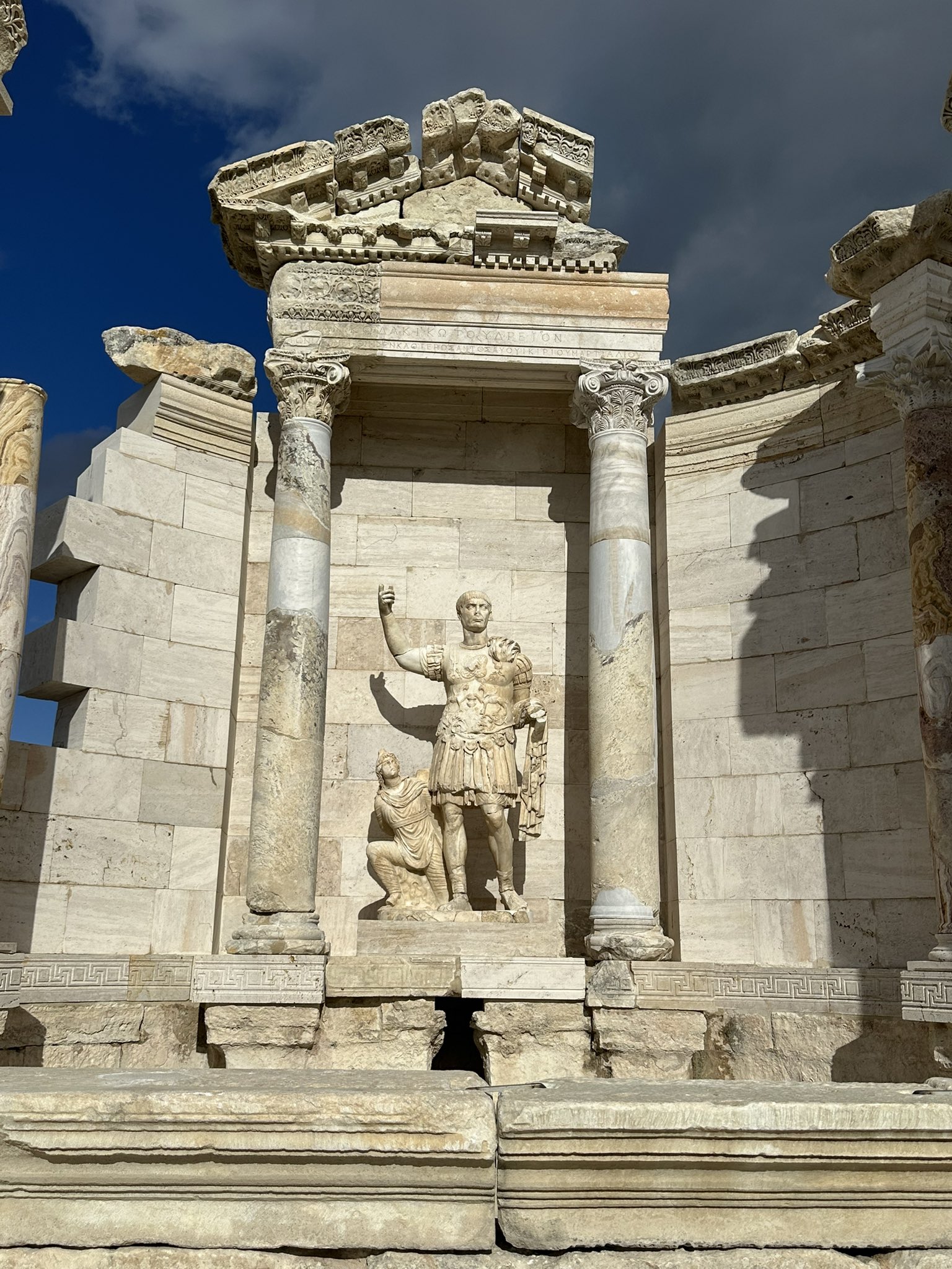 The Nymphaeum of Trajan was unearthed at the southern end of the West Portico of the Stadium Street, bordering the street and the portico connected to it at the southern end. The monumental fountain has a single-storeyed façade with a large square in front of the façade. The fountain, which has a rectangular plan on the exterior, has a façade animated by an apsidal pool and a colonnaded gallery on the interior, which was widely built in the Roman Empire at the end of the 1st century AD. In the monumental Nymphaeum structure, the power of both the Roman Empire and Laodikeia was exhibited to the public as political propaganda with four granite and eight marble columns and pedimented facades on both sides in front. The water law unearthed on the eastern wing of the façade facing the square provides important information about the use of water in the city, its cleanliness, the protection of the line, its distribution, the nature of the officials supervising it, and the penalties and prohibitions to be imposed on those who violate the rules, as well as showing that the monumental fountain was built in 113-114 AD during the reign of Emperor Trajan (98-117 AD). The group sculpture of Emperor Traian and the Daker (Dacia) captive in the pediment carried by two columns, which are higher than the others and arranged in the form of a temple pediment on the main façade of the fountain, reveals the importance of the structure. On the other hand, water was provided from the north side of the fountain, an arched pool at the southern end of the Stadium Street West Portico, and water was provided on three sides, one of which was rectangular in plan, on the east and west sides. The main pool provided water to the part facing the square in the south front.